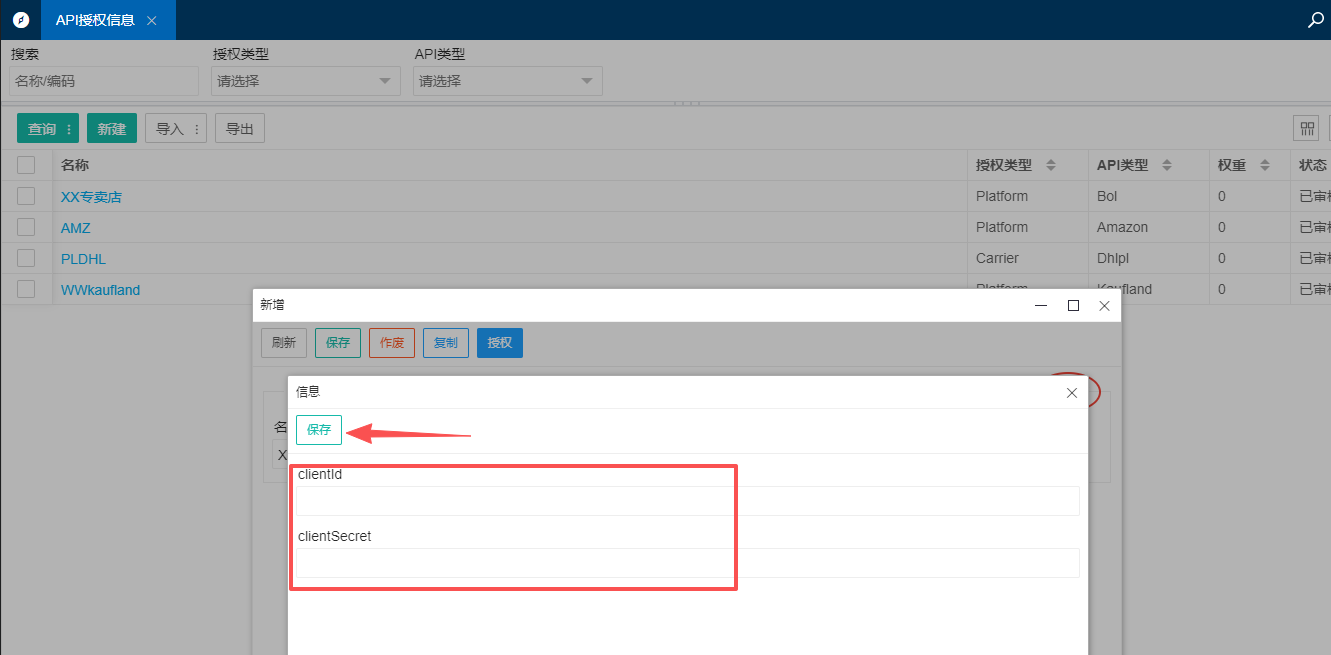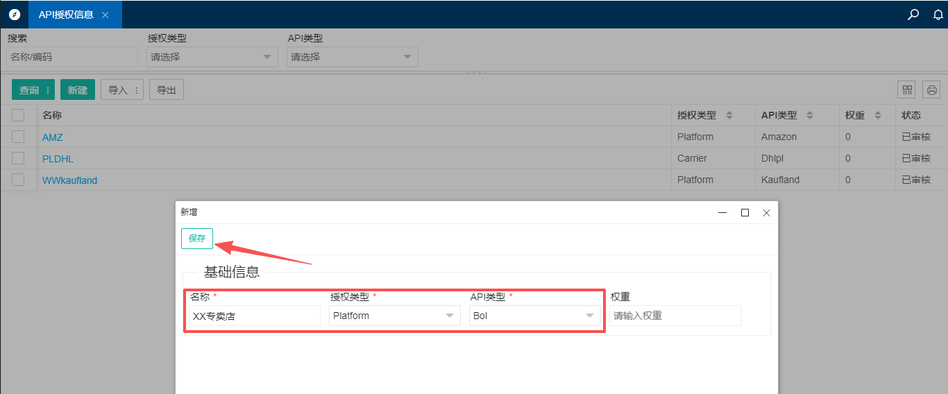 1.打开基础资料中的[API授权信息]->点击新增