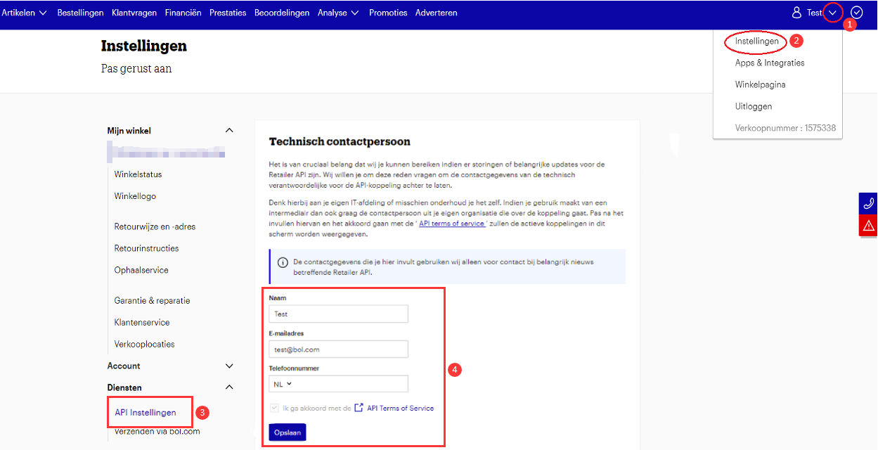1. 登录bol.后台— InstellingenDienstenAPI Instellingen,填写联系方式,单击“Opslaan