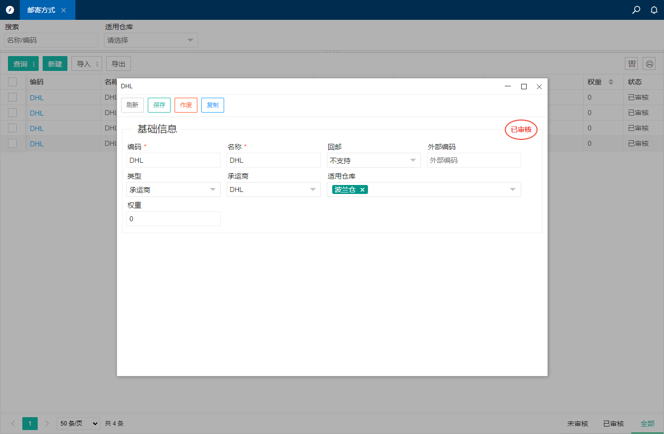 1.打开商品管理中的[邮寄方式]->点击新增,填写