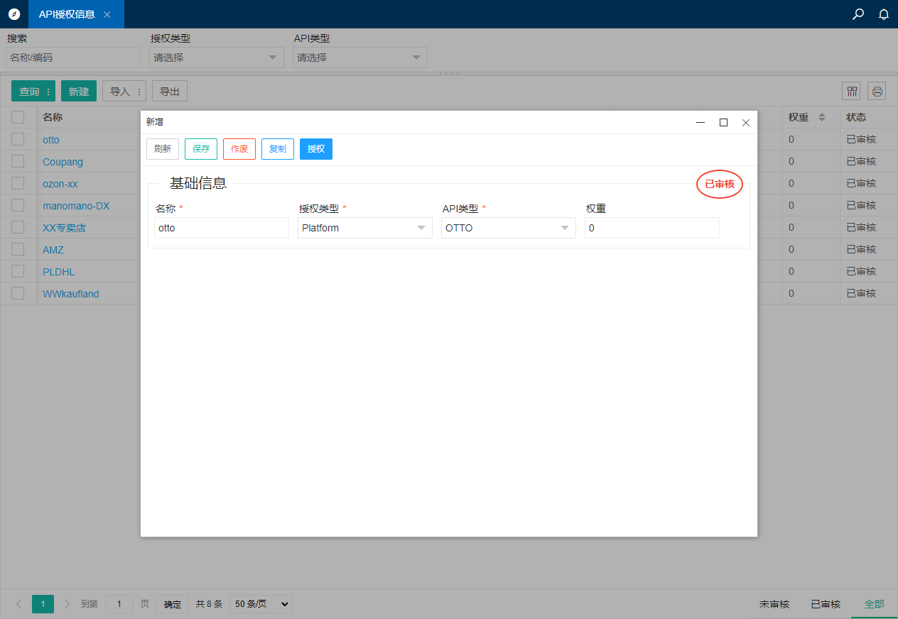 1.打开基础资料中的[API授权信息]->点击新增