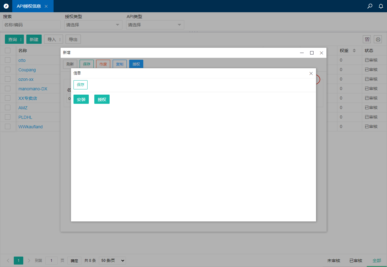 3.保存后点击授权按钮,如果是第一次授权请先点击安装按钮安装应用,如果已安装过应用可以直接点击授权按钮跳转到授权页面完成授权