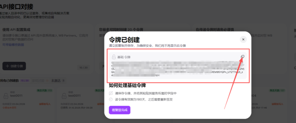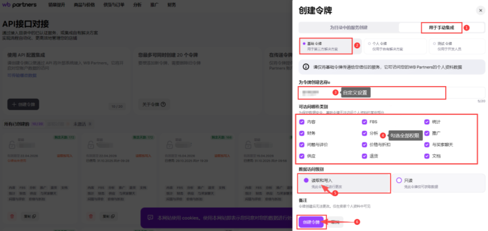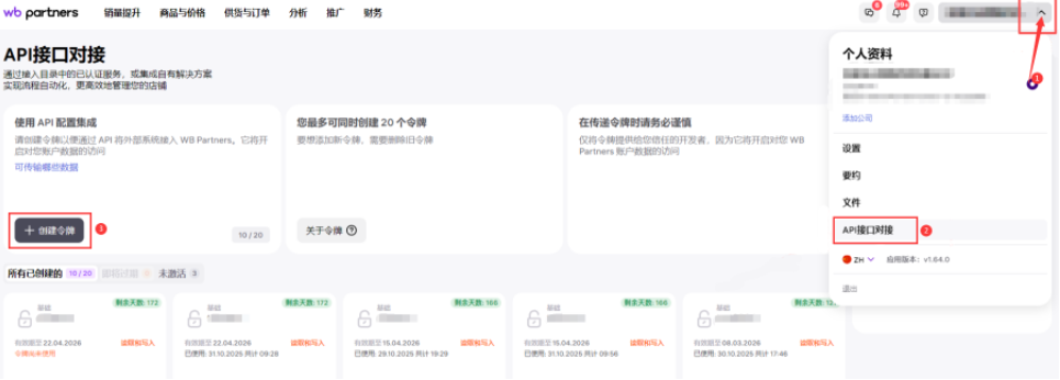 位置:登录Wildberries后台——单击右上角账号信息“∧”——单击【API接口对接】——再单击“创建令牌”