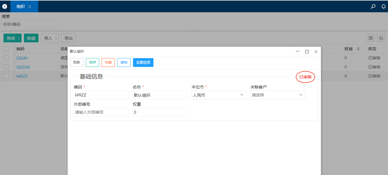 1.打开基础资料中的[组织]->点击新增,填写组织信息后点击保存