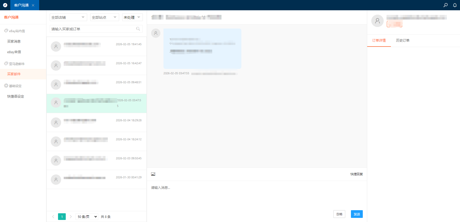 点击亚马逊邮件下的买家邮件即可查看买家邮件列表,可以筛选店铺,站点和处理状态