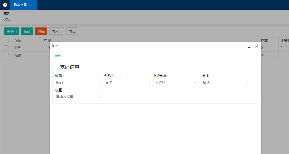 1.打开商品管理中的[物料类别]->点击新增,填写类别信息后点击保存