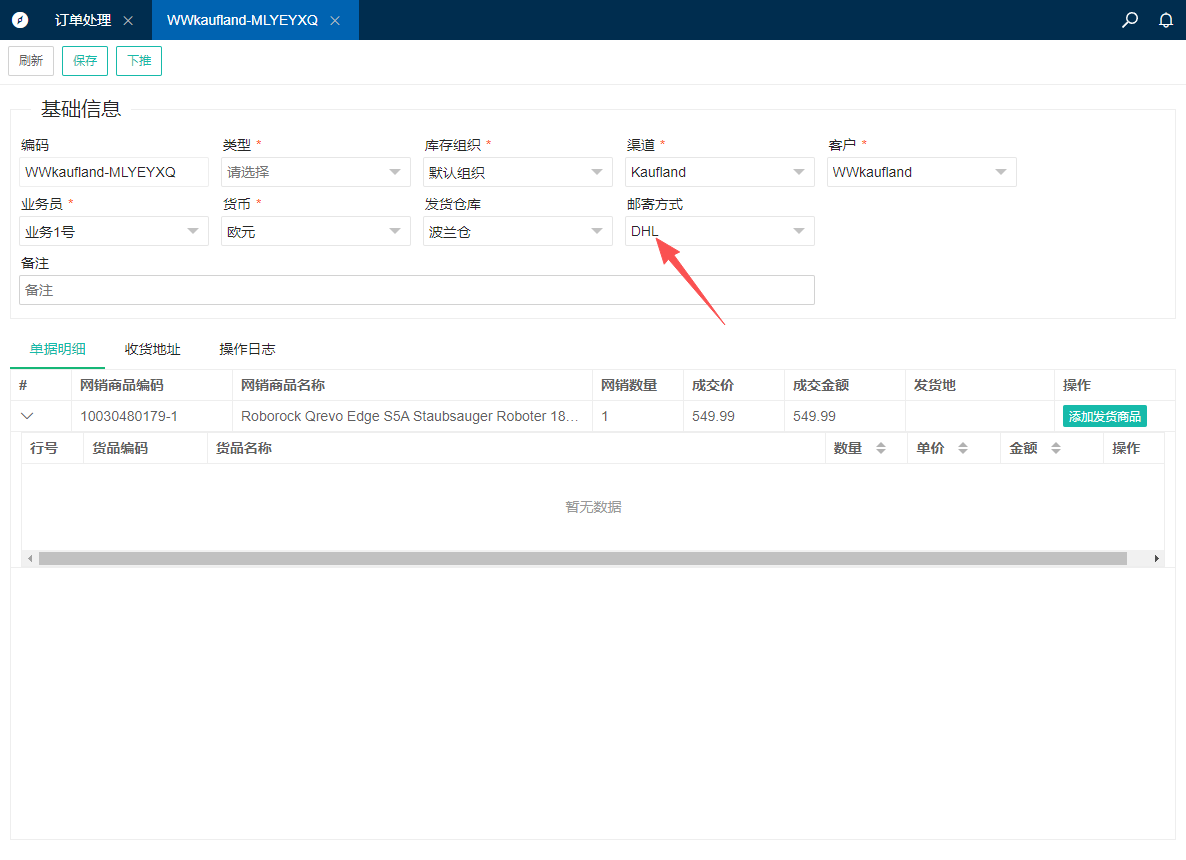 1.点开订单详情,修改邮寄方式,保存,勾选订单,点击"重新核查"