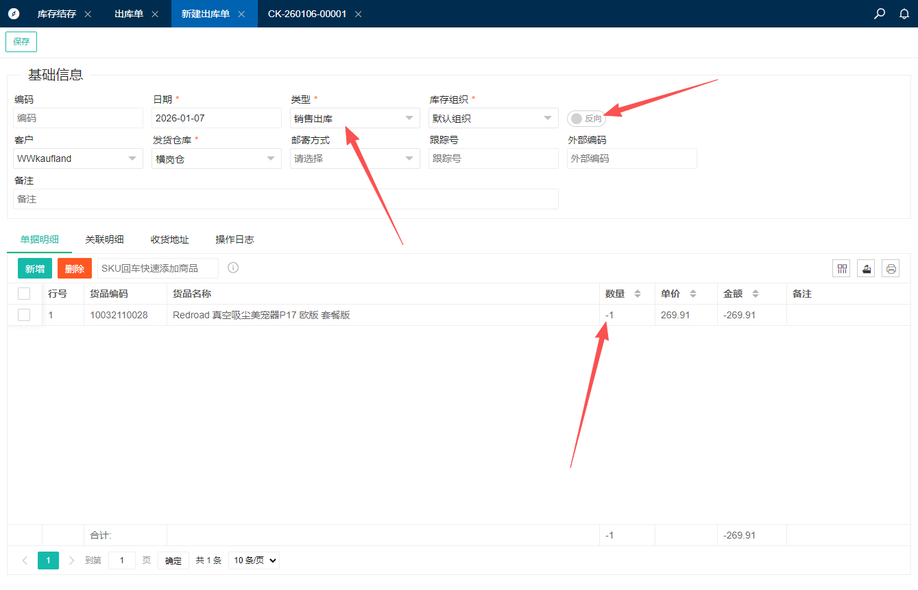 仓储模块中的[出库单]点击新增,类型选择销售出库,方向改为反向,,单据明细中添加需要退货的商品,数量填写